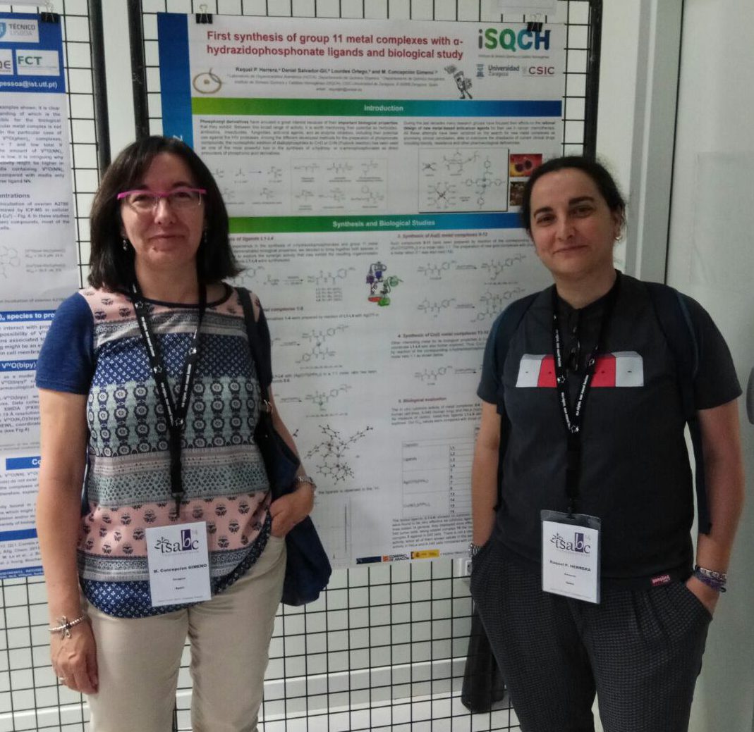 Raquel joins these days the 14th International Symposium on Applied Bioinorganic Chemistry and presents her work together with Prof. Gimeno: “First synthesis of group 11 metal complexes with α-hydrazidophosphonate ligands and biological study” (Raquel P. Herrera, Daniel Salvador, Lourdes Ortego, M. Concepción Gimeno).
