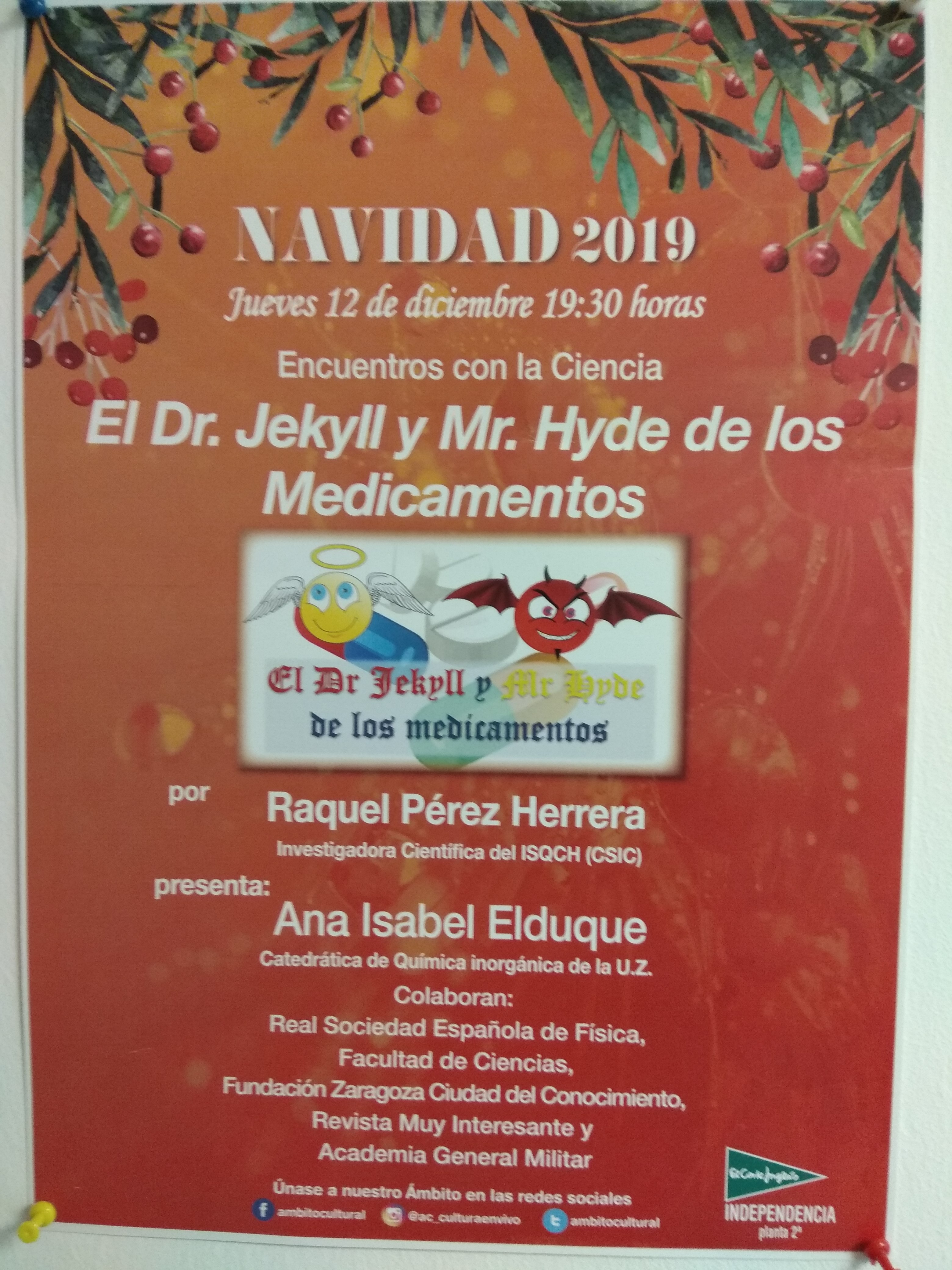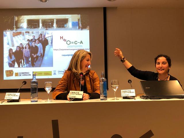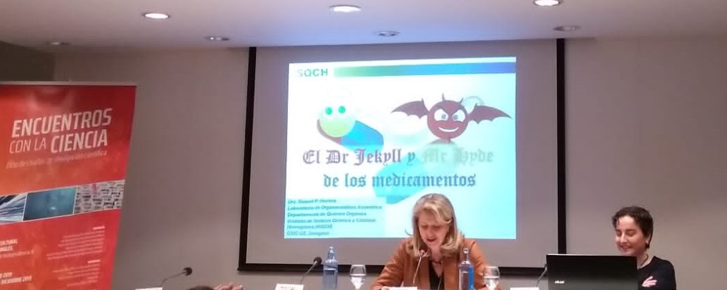 True to its commitment to scientific dissemination, last week, Raquel told to a general public, both, adults (December 12): Ámbito cultural (El Corte Inglés), and young people (December 13): IES Goya (Zaragoza), about the different properties that can show the two enantiomers of drugs containing quaternary carbons.